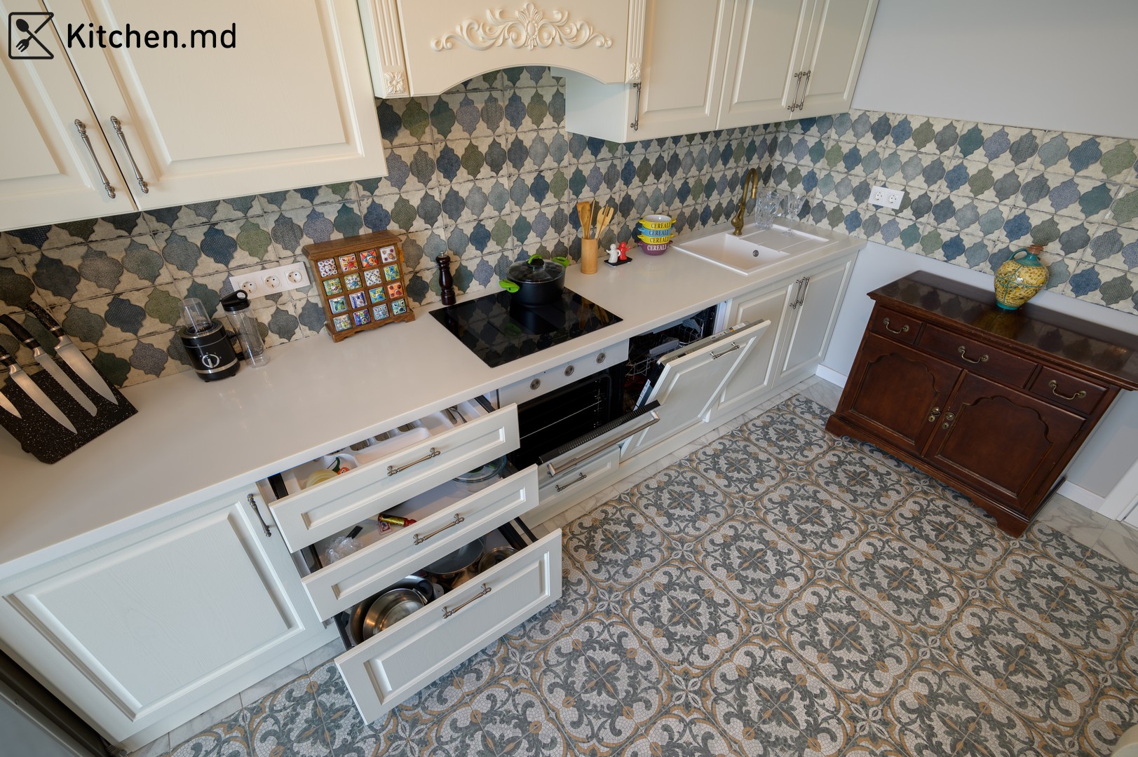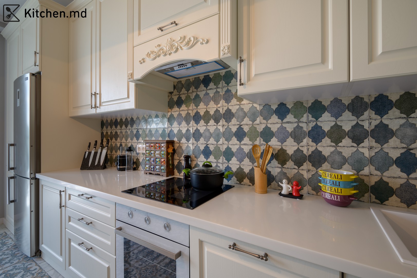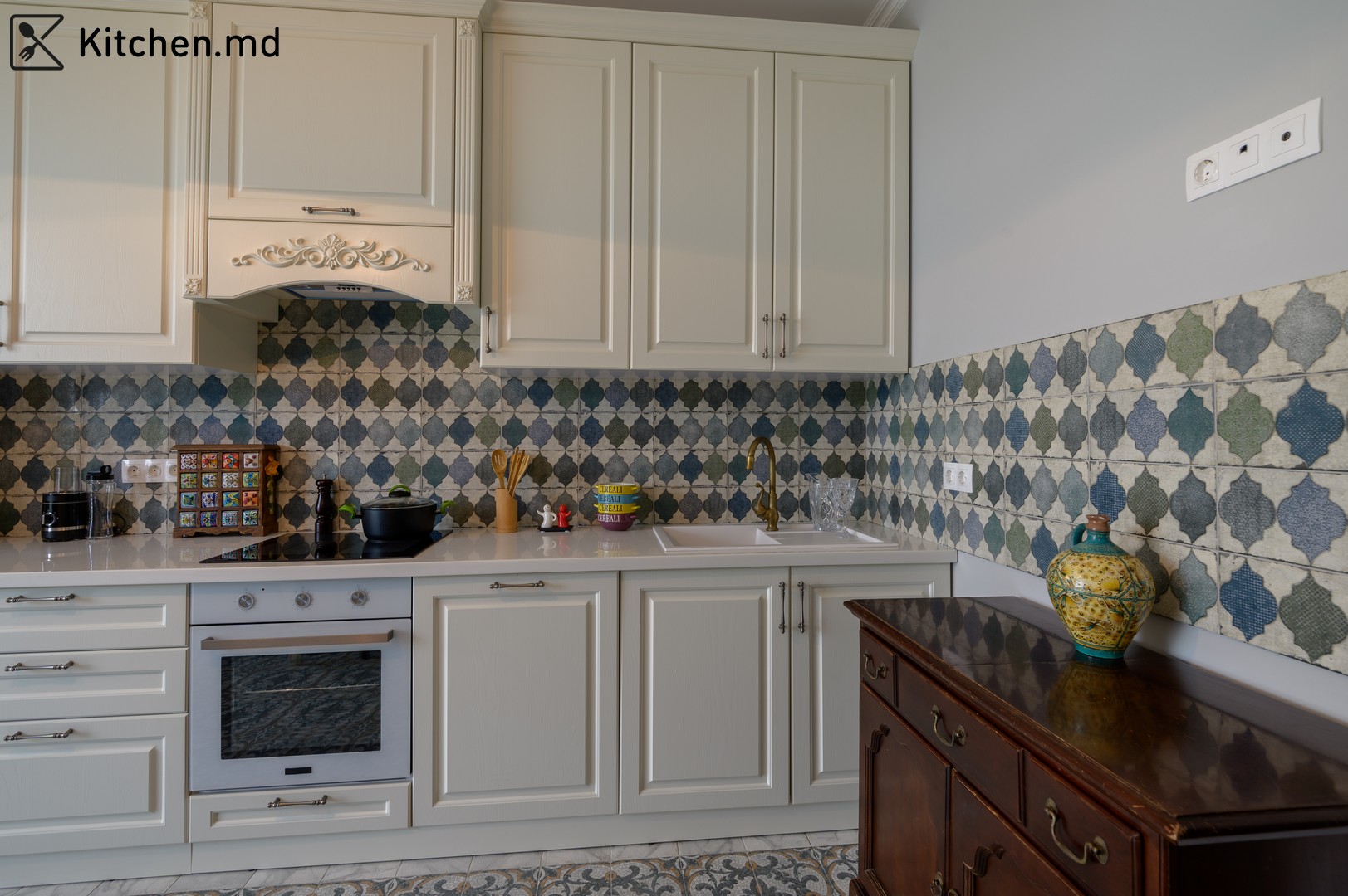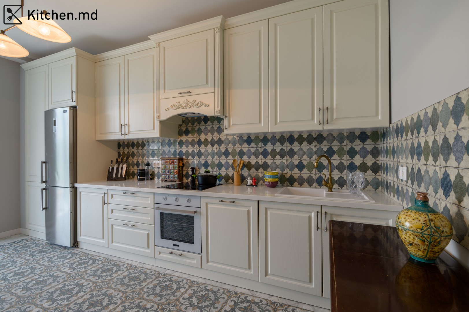 Design Clasic și Elegant: Acest model de bucătărie de la Kitchen.md afișează un design clasic, cu fațade albe, ce conferă un aspect curat și rafinat. Detaliile ornamentale ale dulapurilor adaugă un plus de eleganță, perfect pentru cei ce preferă un stil atemporal.