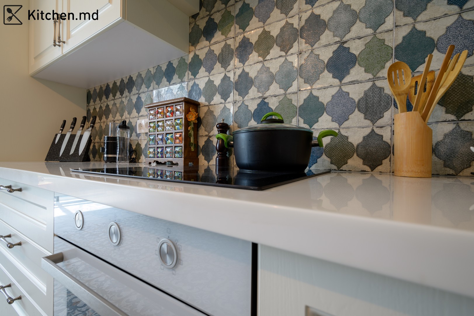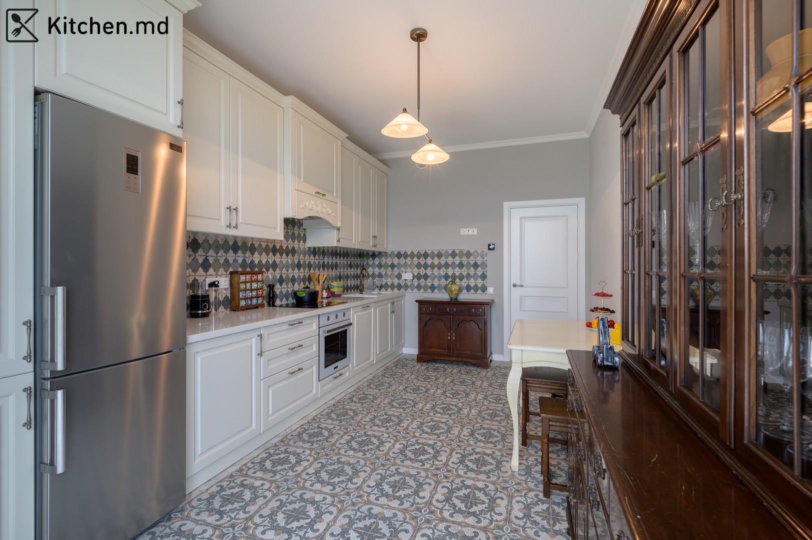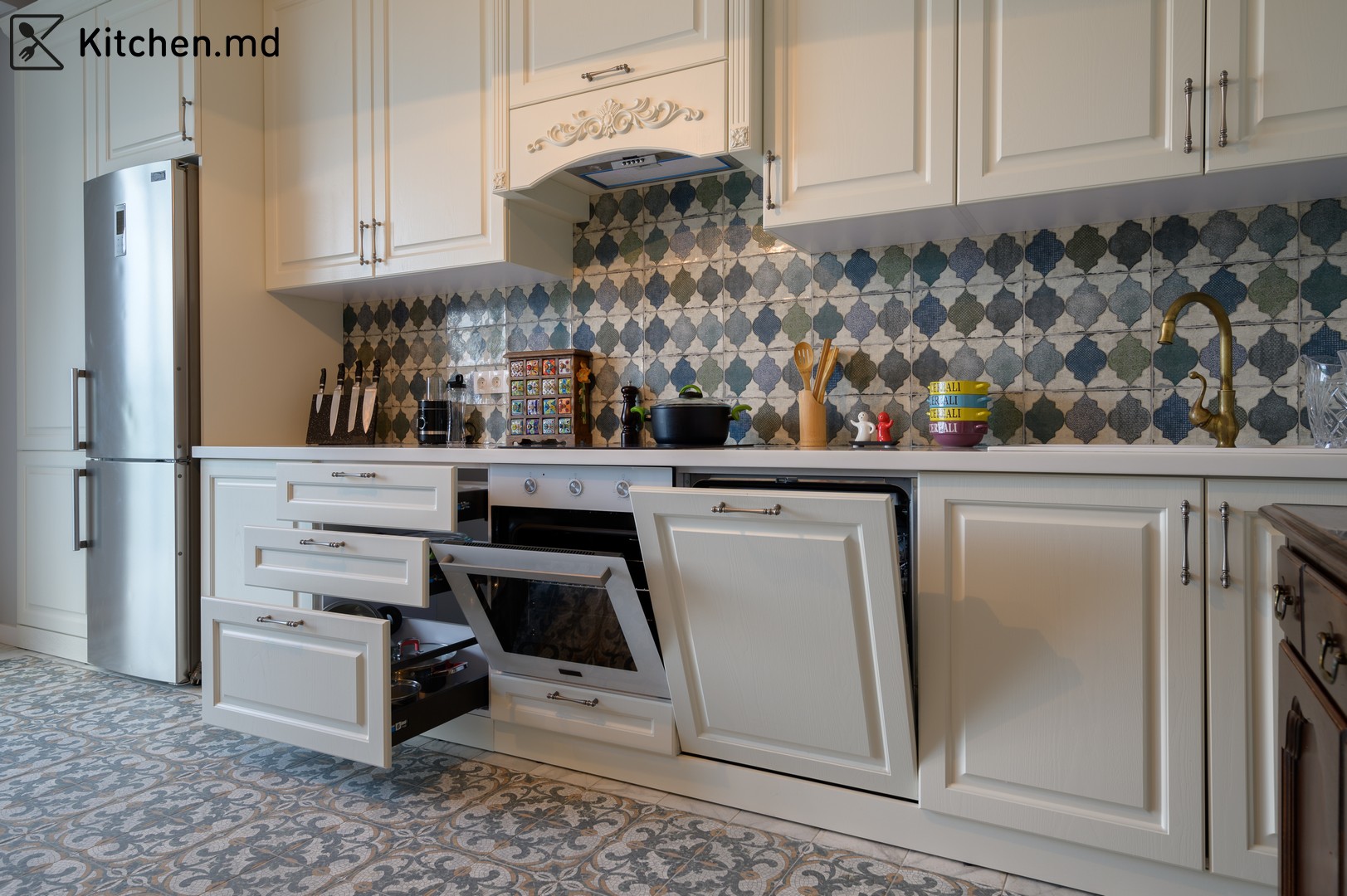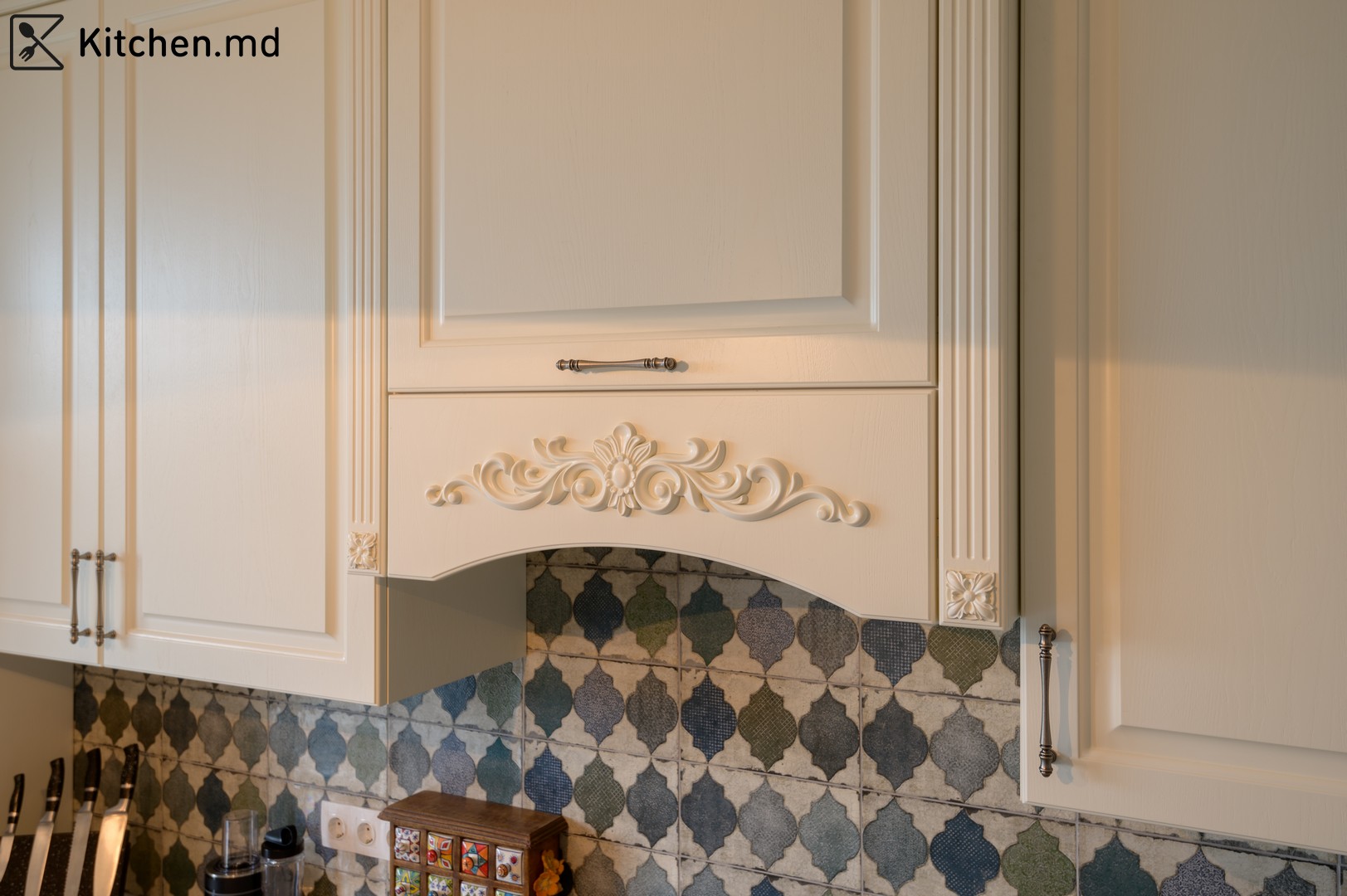 Design Clasic și Elegant: Acest model de bucătărie de la Kitchen.md afișează un design clasic, cu fațade albe, ce conferă un aspect curat și rafinat. Detaliile ornamentale ale dulapurilor adaugă un plus de eleganță, perfect pentru cei ce preferă un stil atemporal.