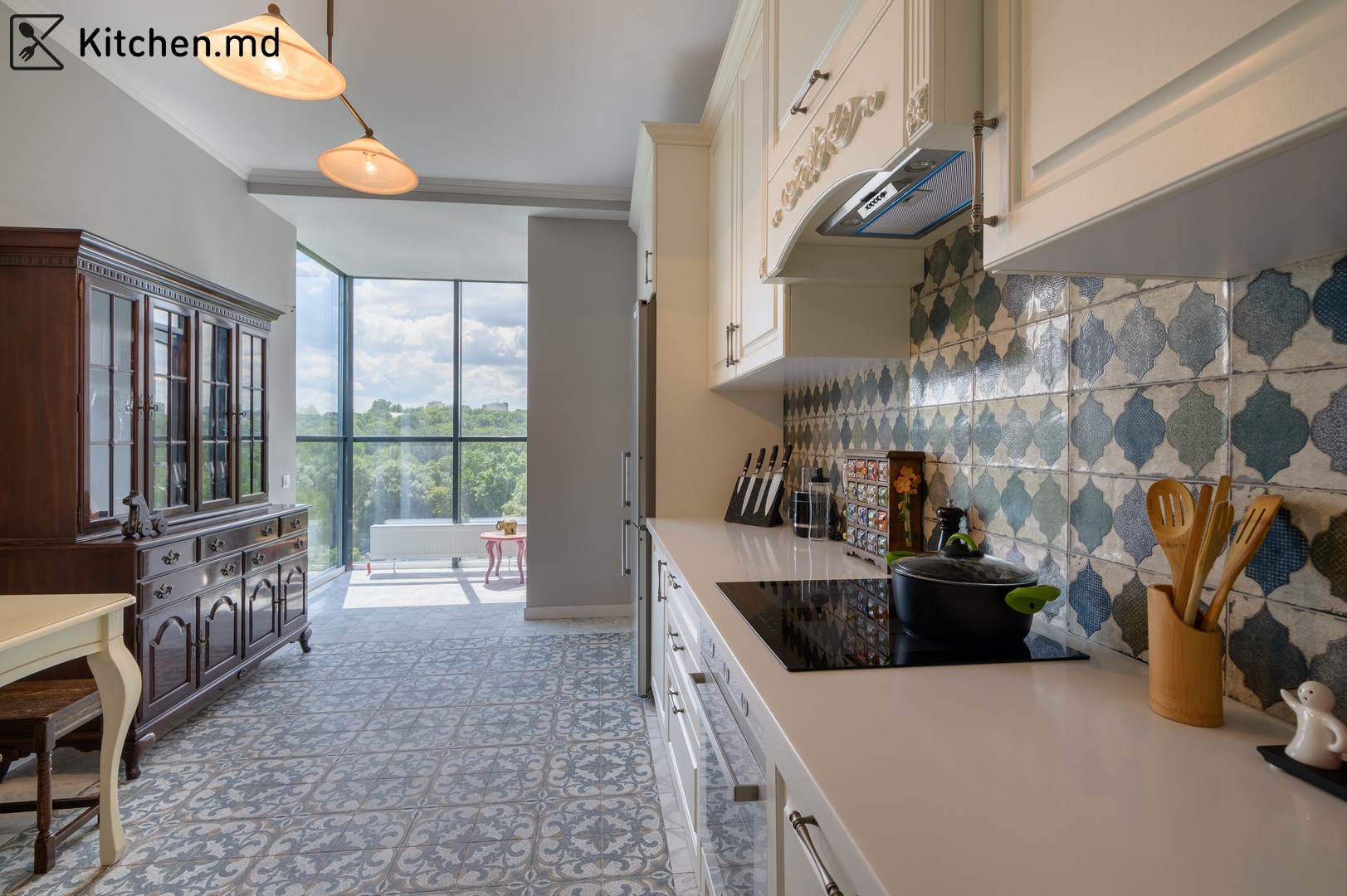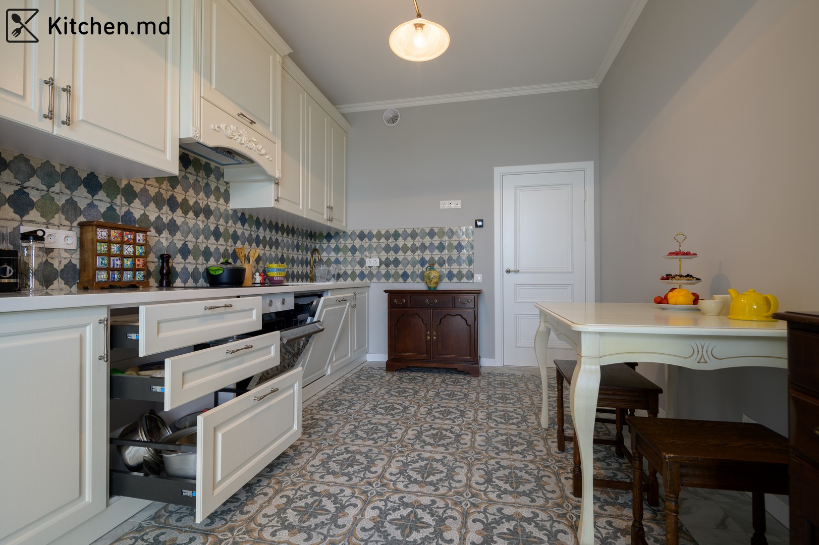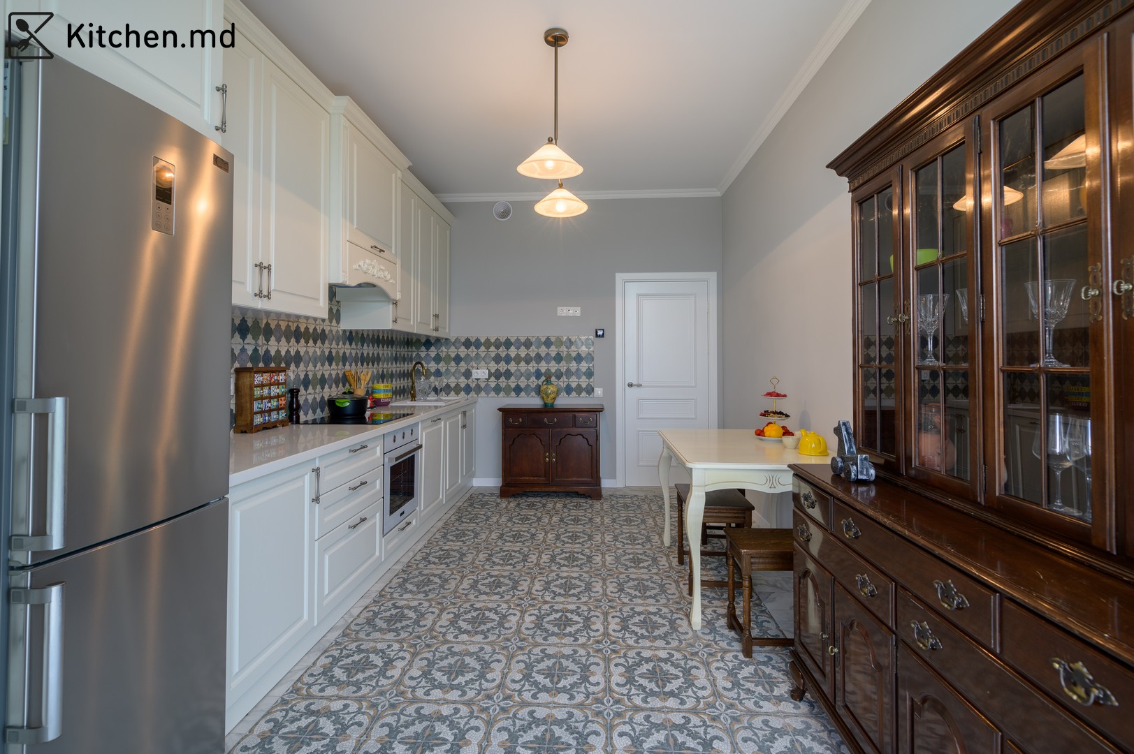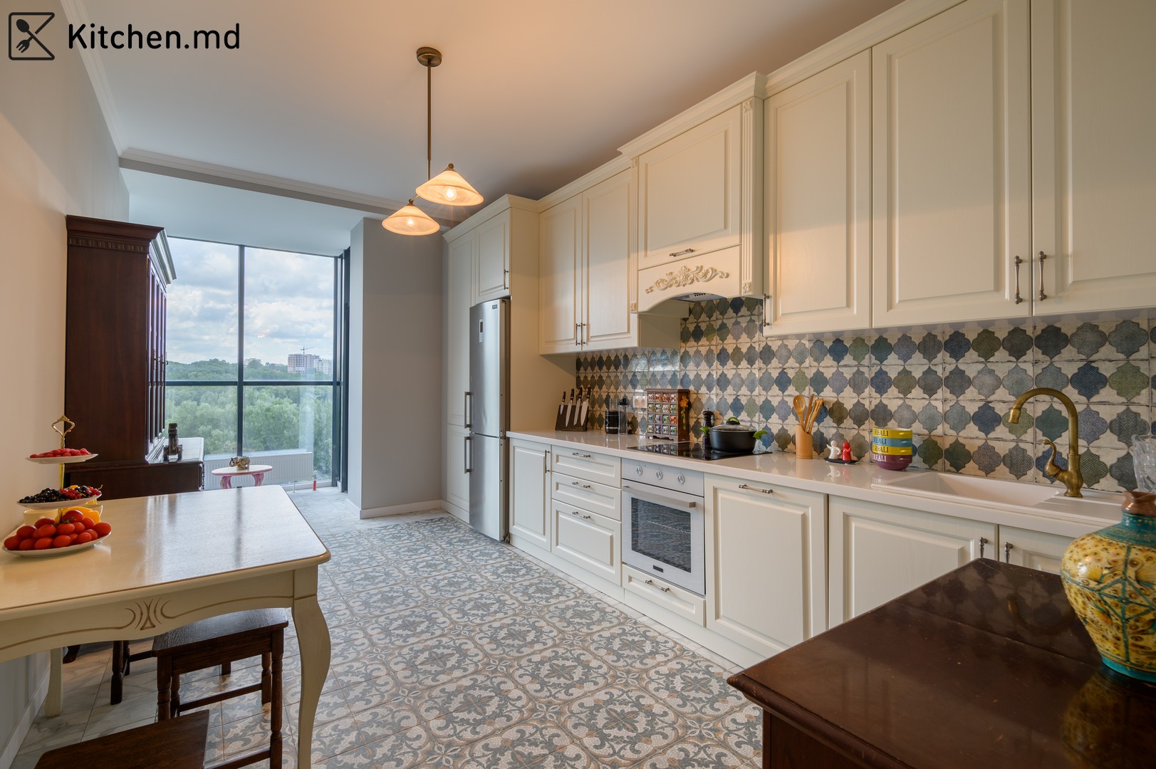 Design Clasic și Elegant: Acest model de bucătărie de la Kitchen.md afișează un design clasic, cu fațade albe, ce conferă un aspect curat și rafinat. Detaliile ornamentale ale dulapurilor adaugă un plus de eleganță, perfect pentru cei ce preferă un stil atemporal.