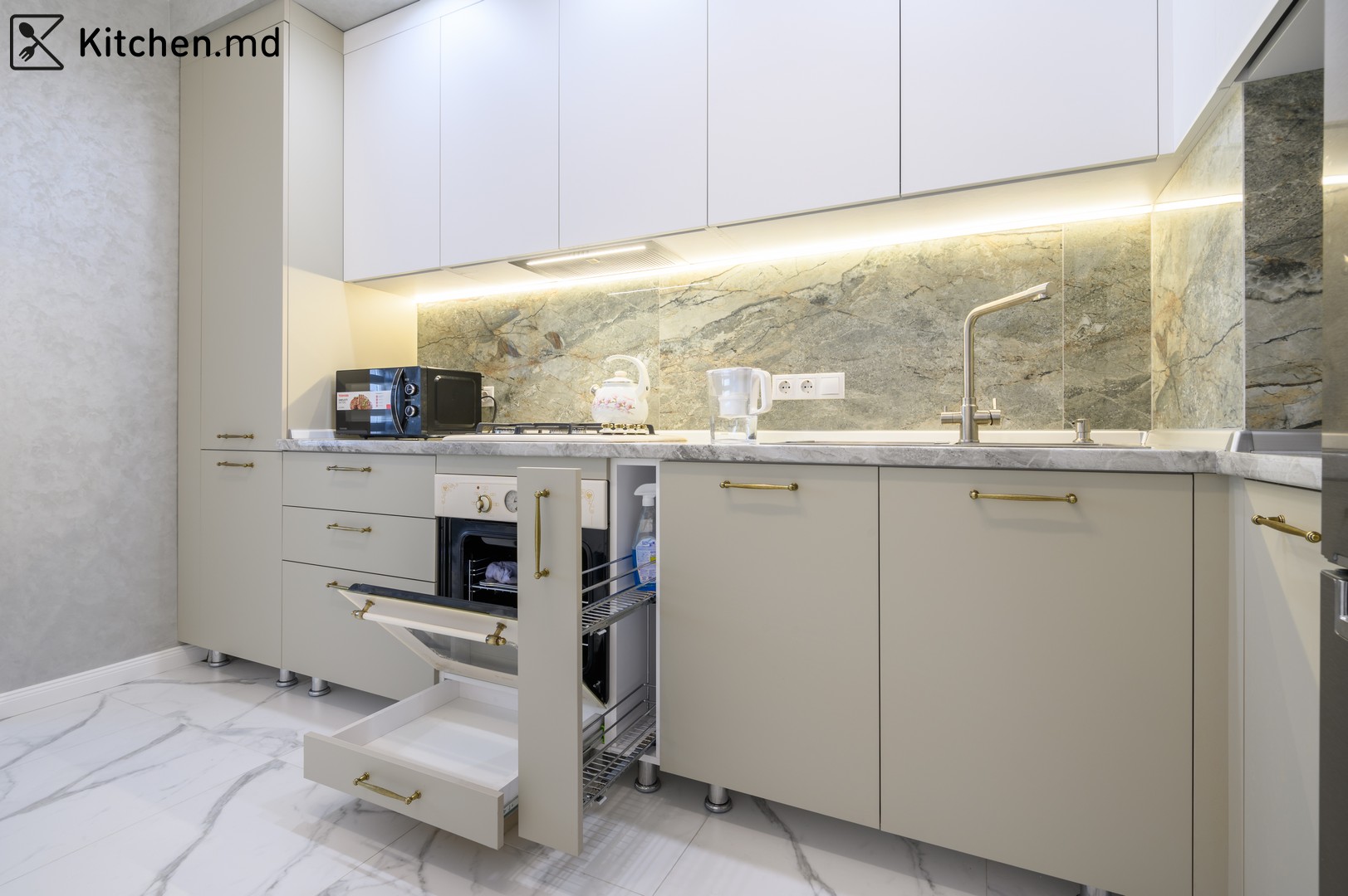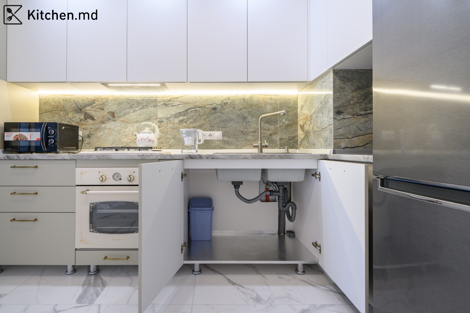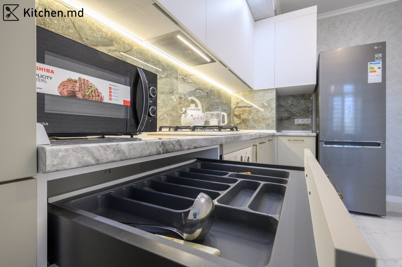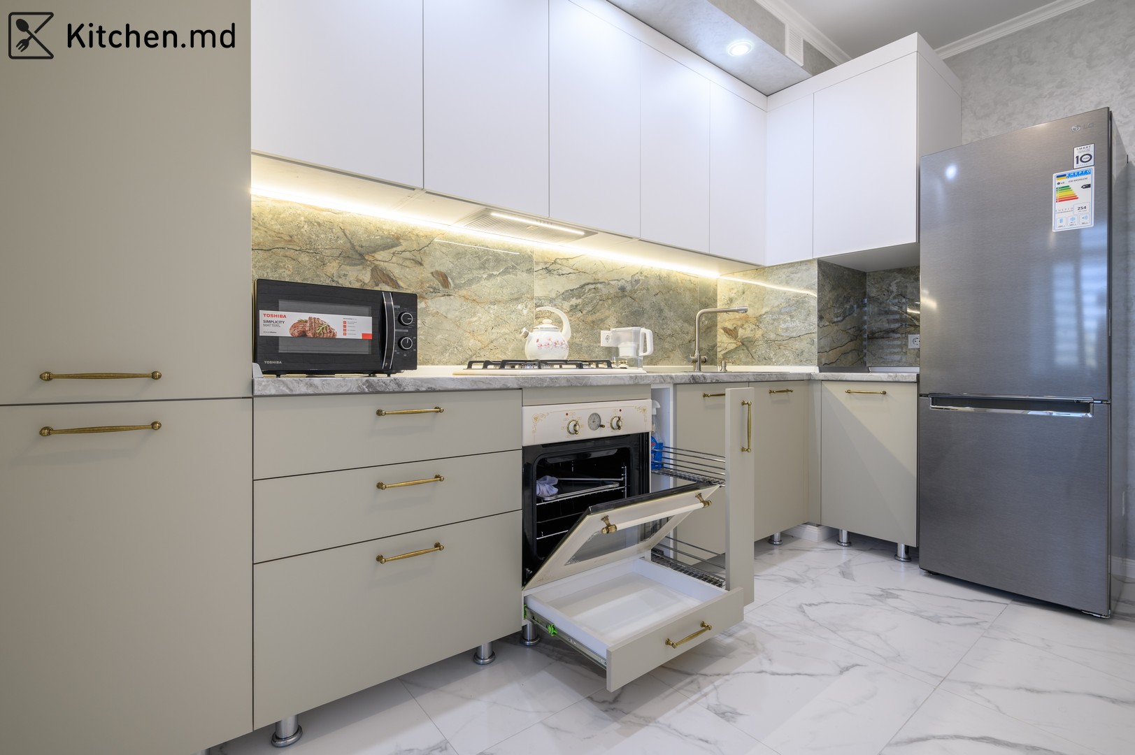 – calitate superioară, suprafețele de lucru și fațadele dulapurilor au un finisaj neted și uniform, care nu doar arată bine, dar sunt și plăcute la atingere. Calitatea finisajului este evidentă în modul în care materialele își mențin aspectul și textura chiar și după ani de utilizare.