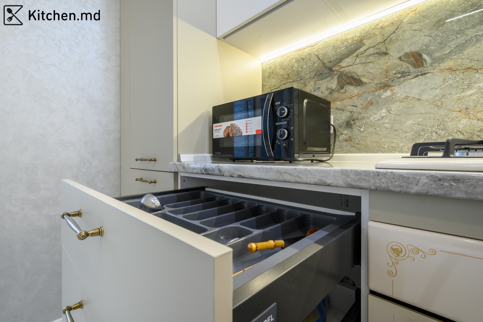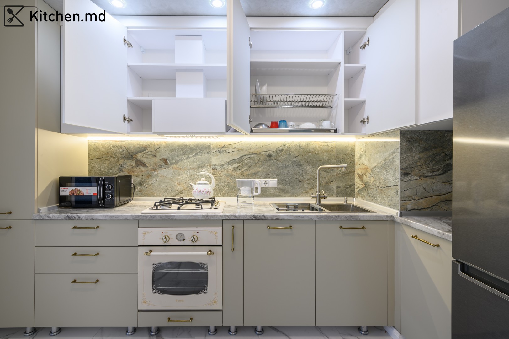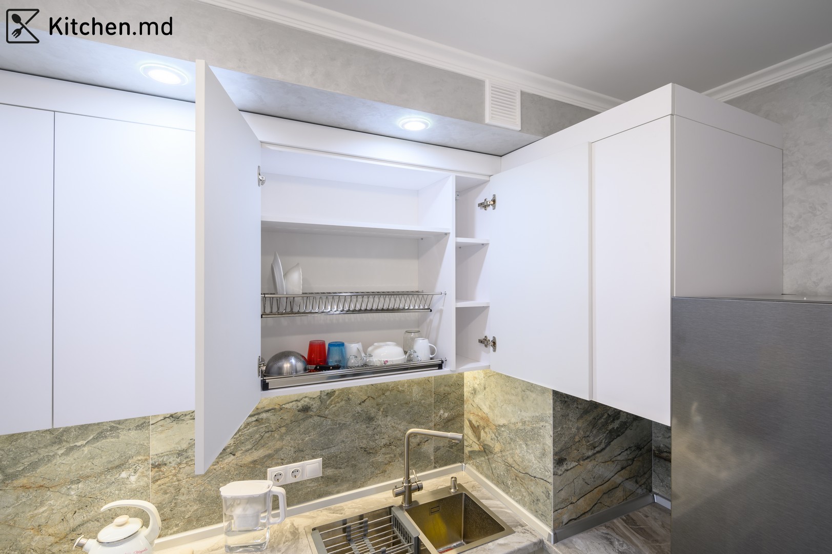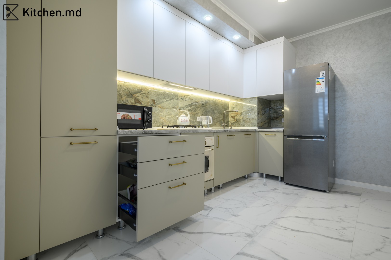 – calitate superioară, suprafețele de lucru și fațadele dulapurilor au un finisaj neted și uniform, care nu doar arată bine, dar sunt și plăcute la atingere. Calitatea finisajului este evidentă în modul în care materialele își mențin aspectul și textura chiar și după ani de utilizare.